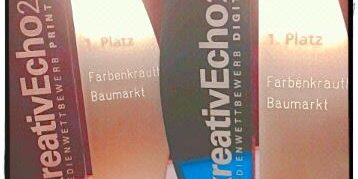 Wahnsinn! Ich habe gestern Abend 2x den „Bambi“ von Darmstadt verliehen bekommen – den KreativEcho 2014: 1. Platz für die kreativste Werbung „Print“ und 1. Platz für „Digital“. Ich freue mich extrem darüber, deshalb muss ich meine Freude mit euch teilen! So kann das Wochenende starten. An dieser Stelle danke ich auch der Jury und meinen Auftraggebern Winfried Krauth und Sascha Labus von farbenkrauth. Und natürlich allen Lesern, die für uns abgestimmt haben.