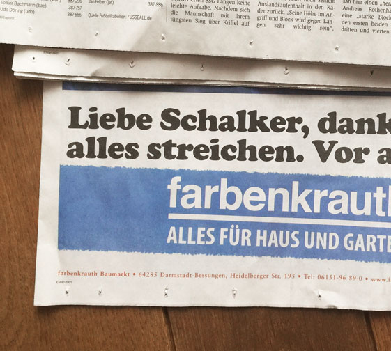 Fußball-Anzeigen machen mir tatsächlich viel Spaß, da man etwas lockerer dran gehen und den Gegner ein bisschen sticheln kann. Natürlich bleibt man dabei sportlich. Ein bisschen Augenzwinkern. Und Farbe ins Gesicht schmieren. So ist diese aktuelle Anzeige für den Darmstädter Baumarkt Farbenkrauth entstanden – für das Heimspiel Lilien vs. Schalke. Das wir dann aber leider verloren…