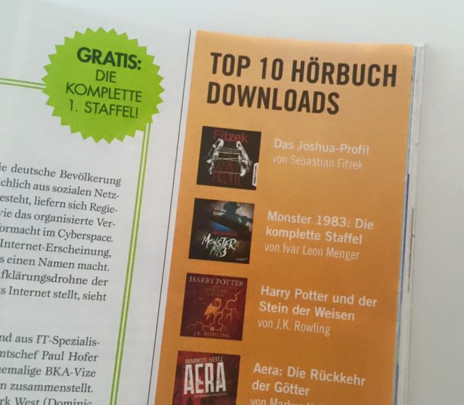Diese Top 10-Audible-Anzeige im aktuellen Bücher-Magazin freut mich sehr! „Monster 1983“ auf Platz 2 der Verkaufscharts, wow! Danke an alle HörerInnen!!! Und herzlichen Glückwunsch zu Platz 1, Sebastian!