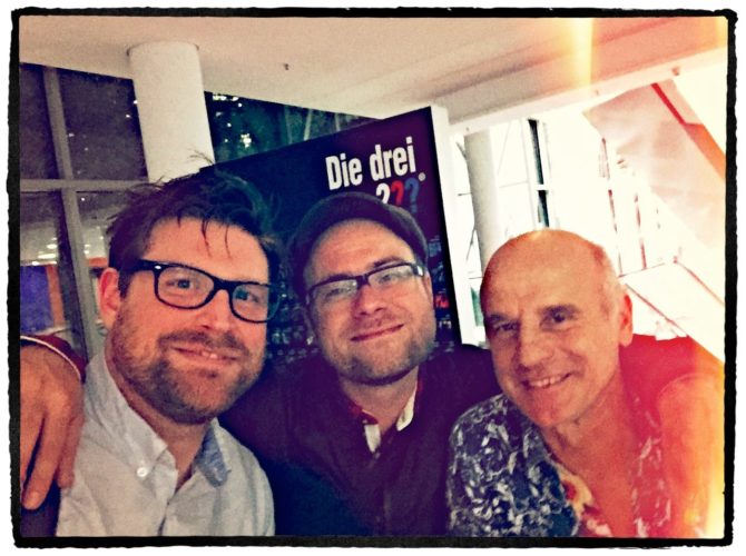 Spezialgelagerte Geburtstagsfeier mit Justus, Peter und Bob: 50 Jahre „Die drei ???“ bei Kosmos auf der Frankfurter Buchmesse 2014. Mit Illustrator Christopher Tauber (Mitte) und Geräuschemacher Jörg Klinkenberg (rechts). Warum wir uns dort getroffen haben? Das bleibt bis jetzt noch ein kleines Geheimnis. Ich sag nur: im Herbst 2015 wird es mehr Infos dazu geben…